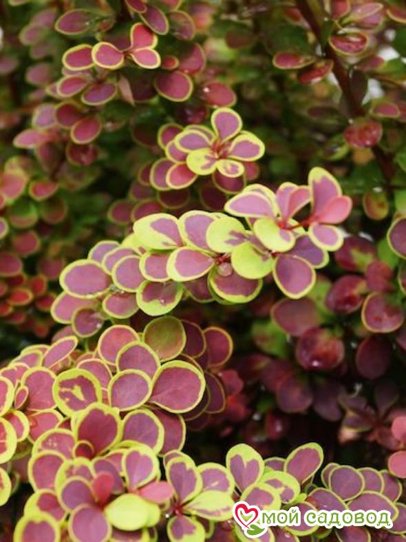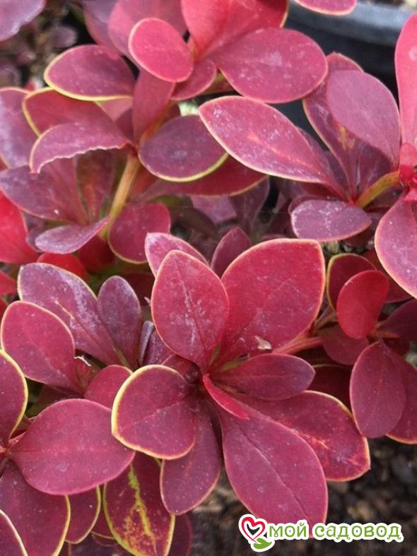 Барбарис тунберга  Голден Ринг (Berberis thunbergii Golden Ring) — раскидистый колючий лиственный кустарник. Высота взрослого растения — до 2,5м, диаметр кроны до 3м. На побегах имеются шипы. Листья овальные или почти округлые, длиной до 3-х см., летом по цвету — фиолетово-красные с жёлтой каймой, осенью — окрашиваются в насыщенно-красные тона. Подобные мутации очень часто возникают у сорта Atropurpurea, на который Golden Ring похож во всем остальном. Растение цветёт в конце мая — начале июня, цветки жёлто-красные. Плоды — красные, блестящие ягоды — созревают в сентябре.